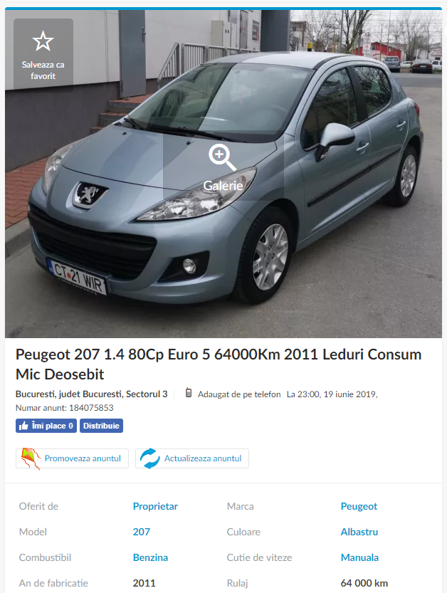 - mașina pe care o dorești trebuie să fi efectuat RAR-ul destul de recent ori să fi fost cumpărată nouă din România. În exemplul de mai jos avem un Peugeot 207 din 2011, cumpărat de nou din România. Din păcate aplicația nu merge pentru toate mașinile, ci doar pentru cele care au trecut măcar o dată pe la RAR în ultimii ani.
